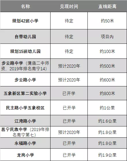 项目本身自带幼儿园,一路之隔规划有1所42班小学、1所15班幼儿园等,500米左右是建设中的步云路中学。周边还有邕宁民族中学、民主路小学五象校区、江湾路小学等教育资源。