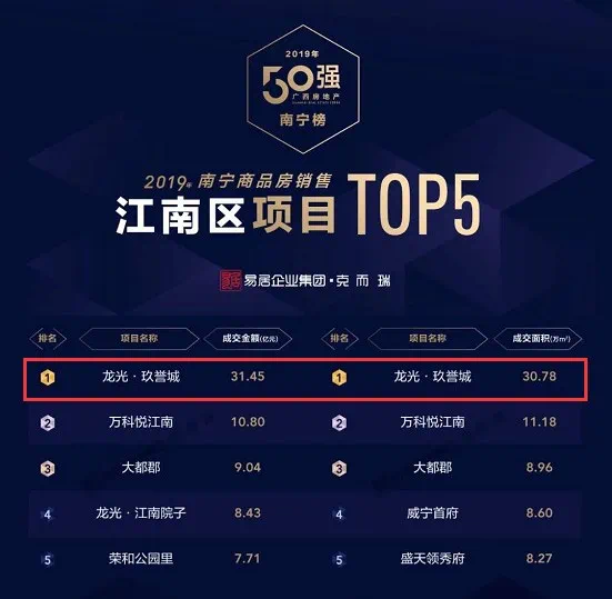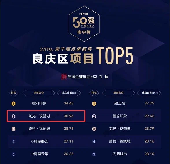 除了昨天新拿的地块,在与玖珑湾1.5公里左右的玖珑臺,也是一个曾在区域创造了无数纪录的“神盘”。而在良庆大桥南的玖誉湖、白沙大道旁的玖誉城,2019年都以销售金额30万+的成绩,登上南宁单盘榜单TOP5。