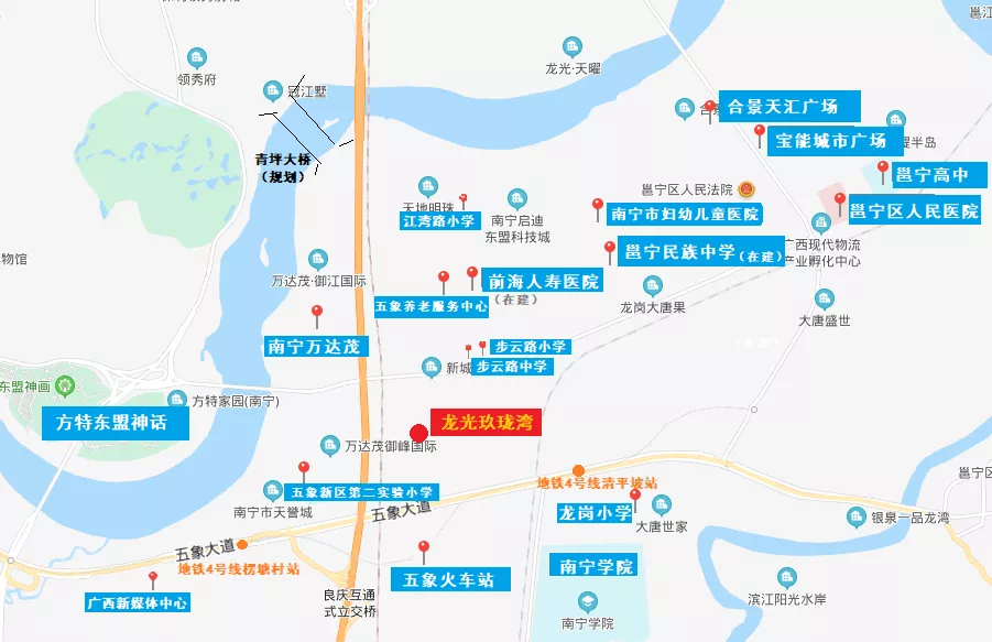 五象大道往北,过江就是青秀区,青秀山风景区、东盟商务区、李宁体育园等配套都能共享。未来青坪大桥开通,去往万象城、会展航洋城就更近了。