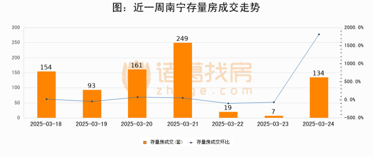从存量房来看,2025年03月24日南宁存量房单日成交134套,比昨日增加127套,环比上涨1814.3%。从近一周存量房成交来看,南宁存量房日均成交套数为116套,03月24日单日成交134套,高于近一周平均水平15.5%。