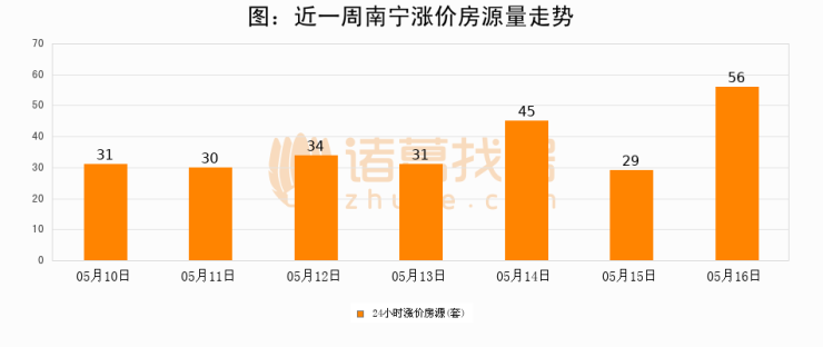 根据诸葛找房数据显示,南宁24小时涨价房源量为56套,较05月15日增加27套,环比上涨93.1%。与此同时,涨价房源占比小幅扩大,业主信心有所提升。