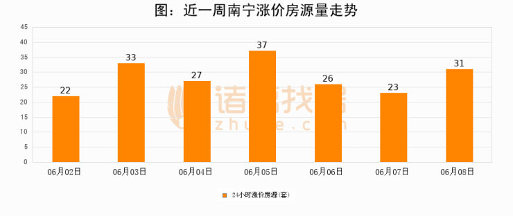 根据诸葛找房数据显示,南宁24小时涨价房源量为31套,较06月07日增加8套,环比上涨34.8%。与此同时,涨价房源占比小幅扩大,业主信心有所提升。