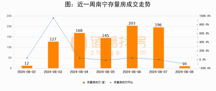 从存量房来看,2024年06月08日南宁存量房单日成交10套,比昨日减少186套,环比下降94.9%。从近一周存量房成交来看,南宁存量房日均成交套数为123套,06月08日单日成交10套,低于近一周平均水平91.9%。