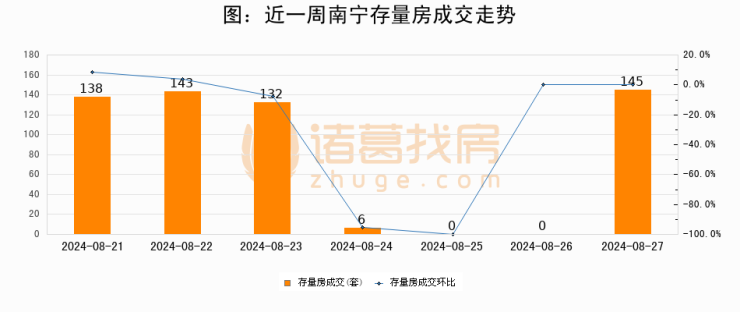 从存量房来看,2024年08月27日南宁存量房单日成交145套,比昨日增加145套,环比上涨0%。从近一周存量房成交来看,南宁存量房日均成交套数为80套,08月27日单日成交145套,高于近一周平均水平81.2%。