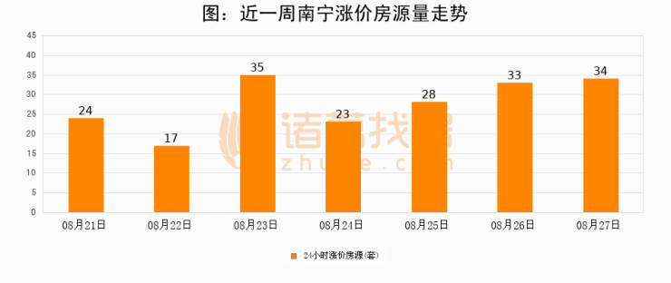 根据诸葛找房数据显示,南宁24小时涨价房源量为34套,较08月26日增加1套,环比上涨3%。与此同时,涨价房源占比小幅扩大,业主信心有所提升。
