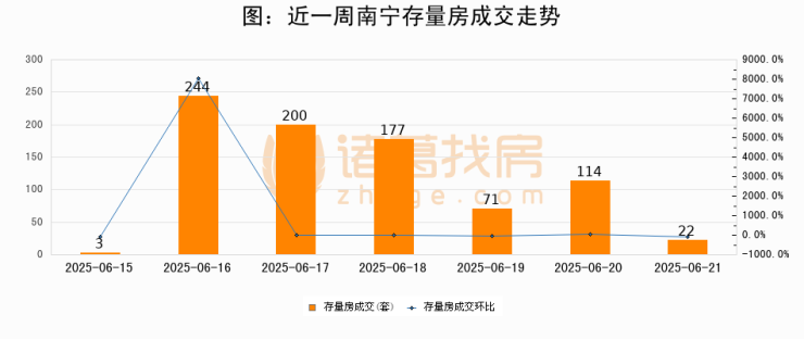 从存量房来看,2025年06月21日南宁存量房单日成交22套,比昨日减少92套,环比下降80.7%。从近一周存量房成交来看,南宁存量房日均成交套数为118套,06月21日单日成交22套,低于近一周平均水平81.4%。