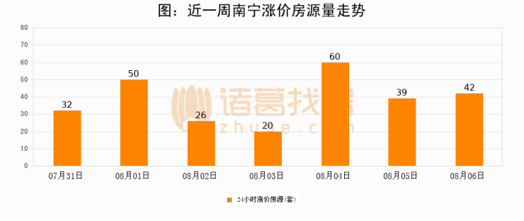 根据诸葛找房数据显示,南宁24小时涨价房源量为42套,较08月05日增加3套,环比上涨7.7%。与此同时,涨价房源占比小幅扩大,业主信心有所提升。
