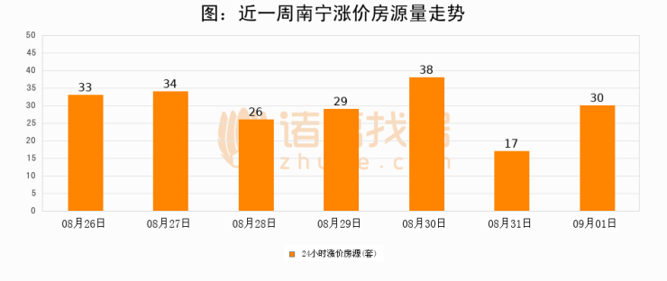 根据诸葛找房数据显示,南宁24小时涨价房源量为30套,较08月31日增加13套,环比上涨76.5%。与此同时,涨价房源占比小幅扩大,业主信心有所提升。