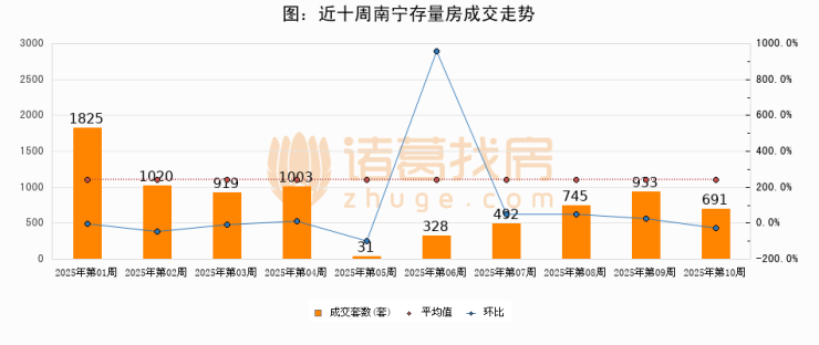 存量房方面,第10周南宁存量房成交691套,较上周减少242套,环比下降25.9%。从近十周成交走势来看,周均成交套数为798套,本周低于平均水平13.4%。