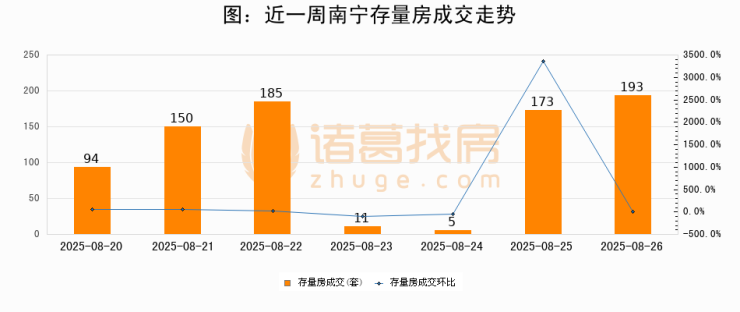从存量房来看,2025年08月26日南宁存量房单日成交193套,比昨日增加20套,环比上涨11.6%。从近一周存量房成交来看,南宁存量房日均成交套数为115套,08月26日单日成交193套,高于近一周平均水平67.8%。
