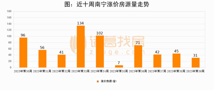 从调价房源来看,第39周南宁涨价房源31套,较上周下降31.1%。与此同时,39周涨价房源占比提升0.29个百分点,业主信心持续恢复。