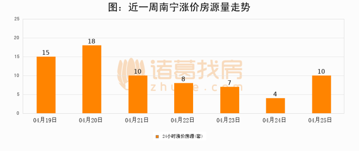 根据诸葛找房数据显示,南宁24小时涨价房源量为10套,较04月24日增加6套,环比上涨150%。与此同时,涨价房源占比小幅扩大,业主信心有所提升。