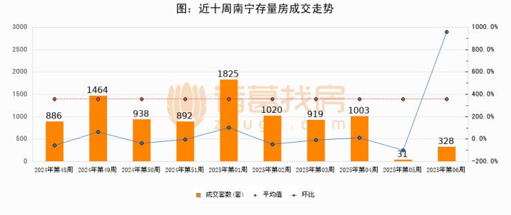 存量房方面,第06周南宁存量房成交328套,较上周增加297套,环比上涨958.1%。从近十周成交走势来看,周均成交套数为930套,本周低于平均水平64.7%。