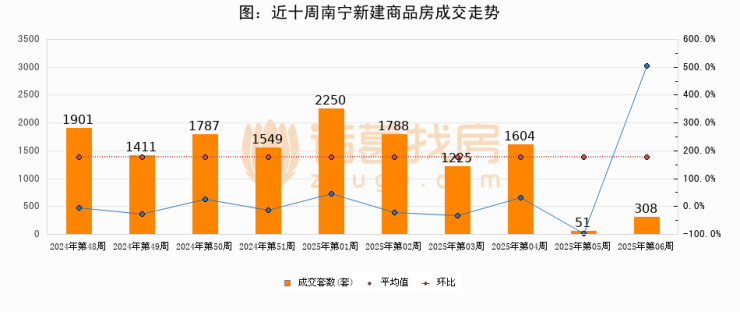 进入2025年第06周(02月03日-02月09日),南宁新建商品房成交308套,较上周增加257套,环比上涨503.9%