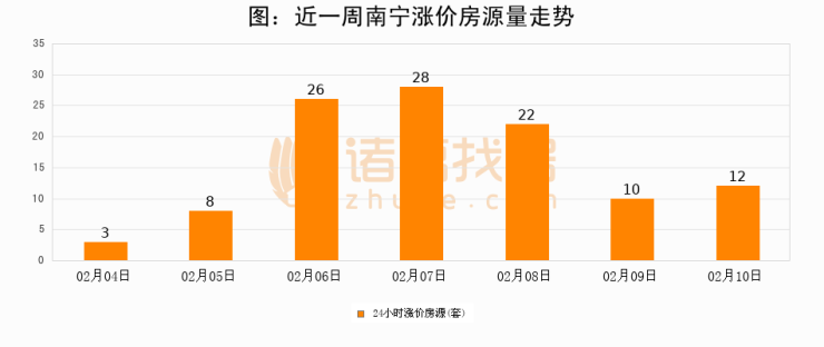 根据诸葛找房数据显示,南宁24小时涨价房源量为12套,较02月09日增加2套,环比上涨20%。与此同时,涨价房源占比小幅扩大,业主信心有所提升。