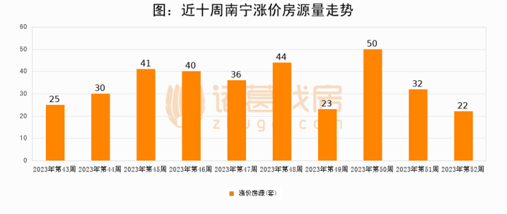 从调价房源来看,第52周南宁涨价房源22套,较上周下降31.2%。与此同时,52周涨价房源占比提升2.13个百分点,业主信心持续恢复。
