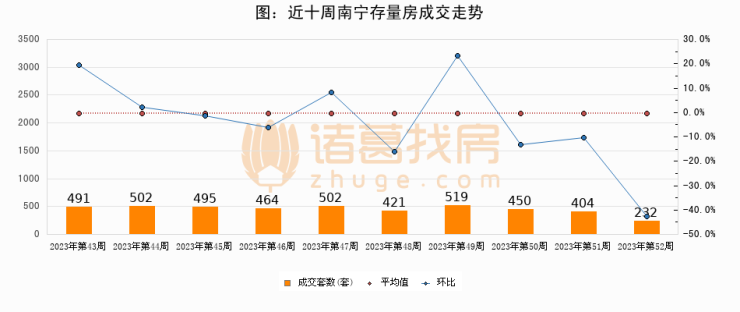 存量房方面,第52周南宁存量房成交232套,较上周减少172套,环比下降42.6%。从近十周成交走势来看,周均成交套数为448套,本周低于平均水平48.2%。