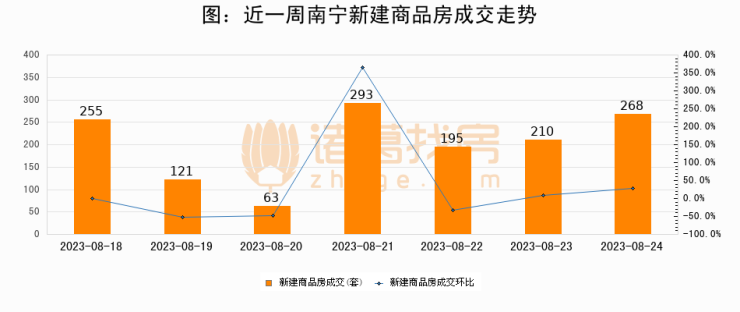 根据南宁市住房和城乡建设局数据显示,2023年08月24日南宁新建商品房成交268套,较昨日增加58套,环比上涨27.6%