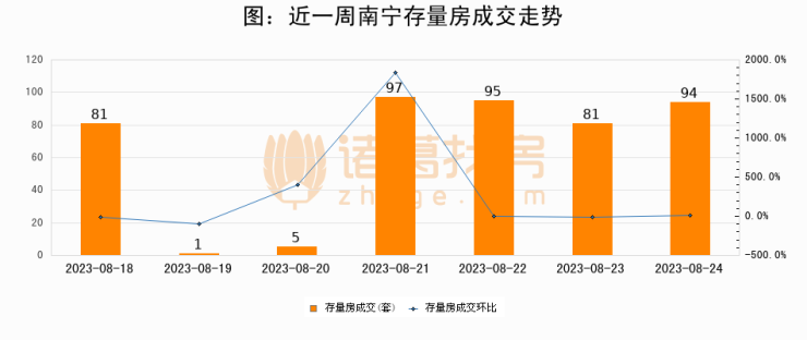 从存量房来看,2023年08月24日南宁存量房单日成交94套,比昨日增加13套,环比上涨16.1%。从近一周存量房成交来看,南宁存量房日均成交套数为64套,08月24日单日成交94套,高于近一周平均水平46.9%。