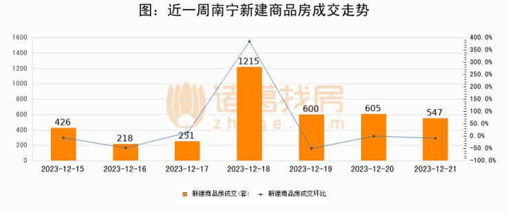 根据南宁市住房和城乡建设局数据显示,2023年12月21日南宁新建商品房成交547套,较昨日减少58套,环比下降9.6%。近一周南宁新建商品房日均成交552套。12月21日单日成交547套,低于近一周平均水平0.9%。