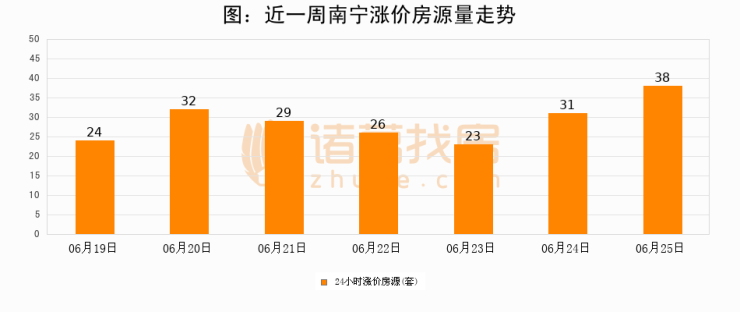 根据诸葛找房数据显示,南宁24小时涨价房源量为38套,较06月24日增加7套,环比上涨22.6%。与此同时,涨价房源占比小幅扩大,业主信心有所提升。