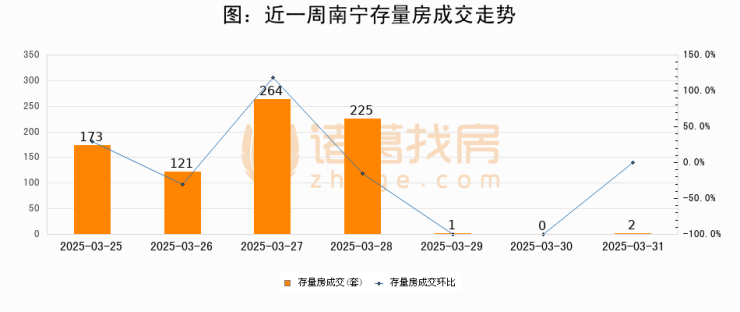 从存量房来看,2025年03月31日南宁存量房单日成交2套,比昨日增加2套,环比上涨0%。从近一周存量房成交来看,南宁存量房日均成交套数为112套,03月31日单日成交2套,低于近一周平均水平98.2%。