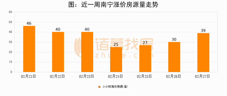 根据诸葛找房数据显示,南宁24小时涨价房源量为39套,较02月26日增加9套,环比上涨30%。与此同时,涨价房源占比小幅扩大,业主信心有所提升。