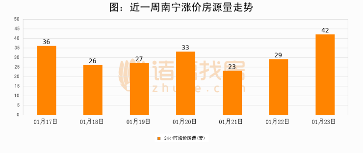 根据诸葛找房数据显示,南宁24小时涨价房源量为42套,较01月22日增加13套,环比上涨44.8%。与此同时,涨价房源占比小幅扩大,业主信心有所提升。