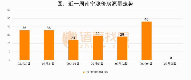 根据诸葛找房数据显示,南宁24小时涨价房源量为0套,较09月04日减少46套,环比下降100%。与此同时,涨价房源占比小幅回落,对于购房者来说是一个入市窗口期,购房者可抓住时机入市。