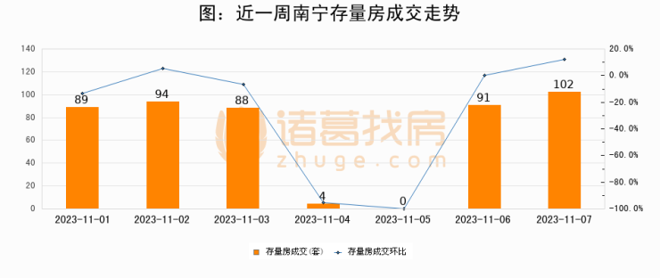 从存量房来看,2023年11月07日南宁存量房单日成交102套,比昨日增加11套,环比上涨12.1%。从近一周存量房成交来看,南宁存量房日均成交套数为66套,11月07日单日成交102套,高于近一周平均水平54.5%。