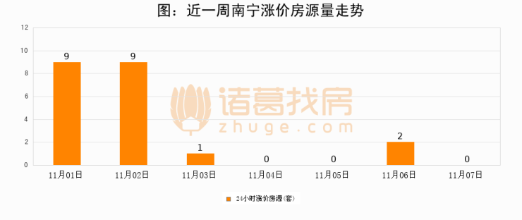 根据诸葛找房数据显示,南宁24小时涨价房源量为0套,较11月06日减少2套,环比下降100%。与此同时,涨价房源占比小幅回落,对于购房者来说是一个入市窗口期,购房者可抓住时机入市。