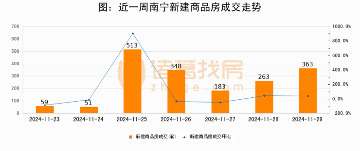 根据南宁市住房和城乡建设局数据显示,2024年11月29日南宁新建商品房成交363套,较昨日增加100套,环比上涨38%