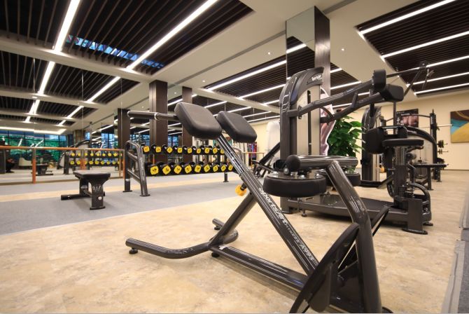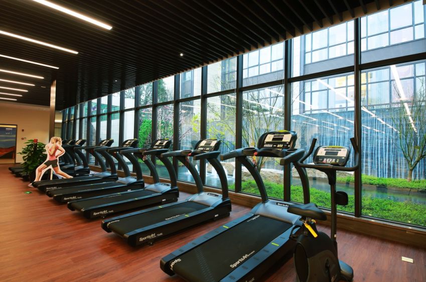 有氧器械区内,180°无死角视觉全景,让健身的人更能够集中注意力。一排排豪华跑步机陈列,520mm超宽大跑台,搭载全跑台专利减震技术,钻石纹路跑带,且其特有的抗震高跑台以普通跑台高而厚重坚实,让跑途安全无虞。打开跑步机,看着窗外下沉式水井的潺潺流水,细听涓涓细流淌过,优哉游哉。