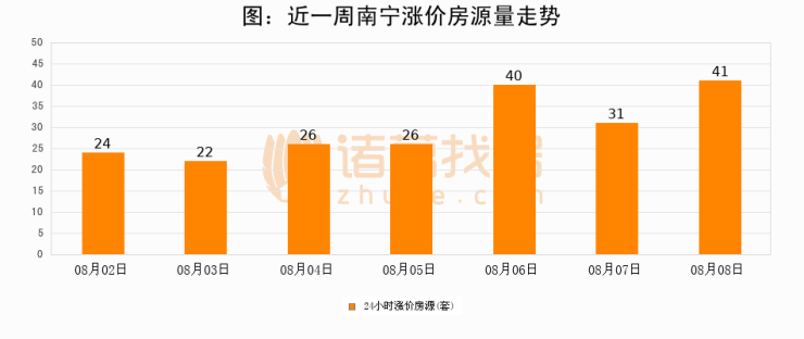 根据诸葛找房数据显示,南宁24小时涨价房源量为41套,较08月07日增加10套,环比上涨32.3%。与此同时,涨价房源占比小幅扩大,业主信心有所提升。