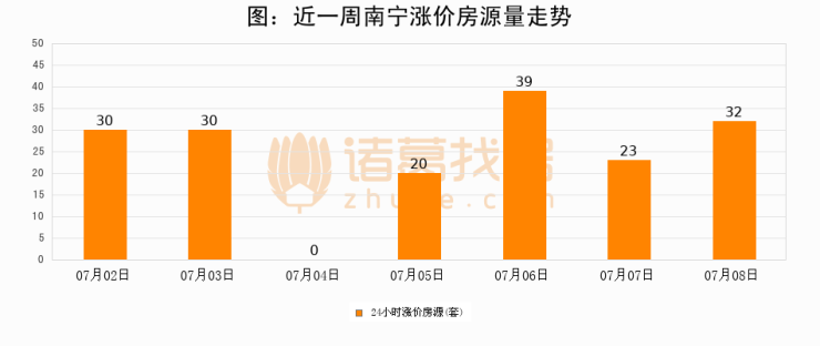 根据诸葛找房数据显示,南宁24小时涨价房源量为32套,较07月07日增加9套,环比上涨39.1%。与此同时,涨价房源占比小幅扩大,业主信心有所提升。