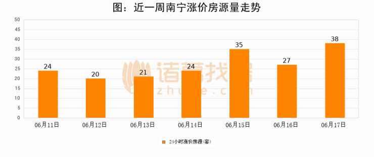 根据诸葛找房数据显示,南宁24小时涨价房源量为38套,较06月16日增加11套,环比上涨40.7%。与此同时,涨价房源占比小幅扩大,业主信心有所提升。
