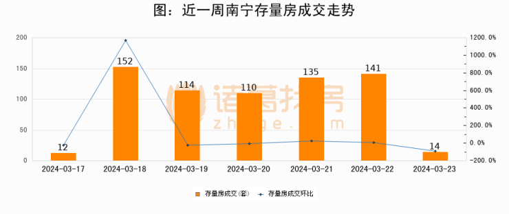 从存量房来看,2024年03月23日南宁存量房单日成交14套,比昨日减少127套,环比下降90.1%。从近一周存量房成交来看,南宁存量房日均成交套数为96套,03月23日单日成交14套,低于近一周平均水平85.4%。