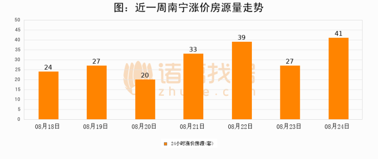 根据诸葛找房数据显示,南宁24小时涨价房源量为41套,较08月23日增加14套,环比上涨51.9%。与此同时,涨价房源占比小幅扩大,业主信心有所提升。