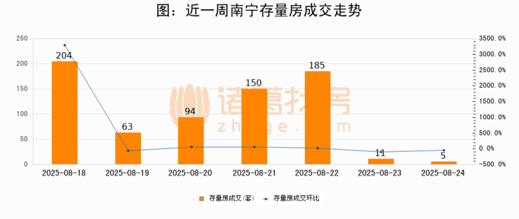 从存量房来看,2025年08月24日南宁存量房单日成交5套,比昨日减少6套,环比下降54.5%。从近一周存量房成交来看,南宁存量房日均成交套数为101套,08月24日单日成交5套,低于近一周平均水平95%。
