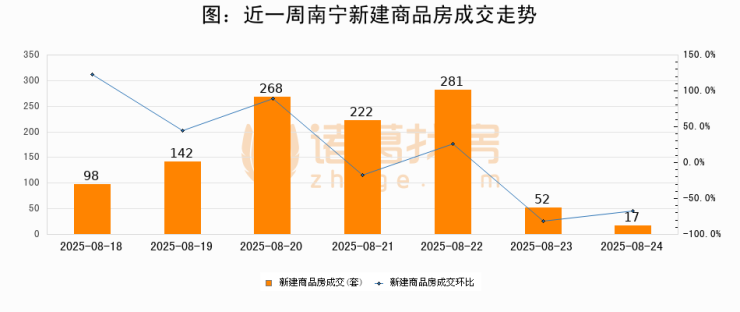 根据南宁市住房和城乡建设局数据显示,2025年08月24日南宁新建商品房成交17套,较昨日减少35套,环比下降67.3%。近一周南宁新建商品房日均成交155套。08月24日单日成交17套,低于近一周平均水平89%。