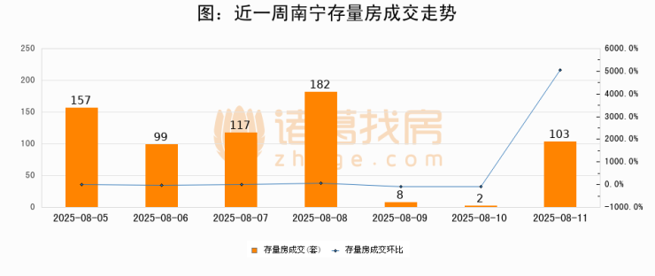 从存量房来看,2025年08月11日南宁存量房单日成交103套,比昨日增加101套,环比上涨5050%。从近一周存量房成交来看,南宁存量房日均成交套数为95套,08月11日单日成交103套,高于近一周平均水平8.4%。