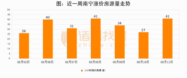 根据诸葛找房数据显示,南宁24小时涨价房源量为41套,较08月10日增加14套,环比上涨51.9%。与此同时,涨价房源占比小幅扩大,业主信心有所提升。