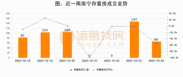 从存量房来看,2023年10月24日南宁存量房单日成交66套,比昨日减少81套,环比下降55.1%。从近一周存量房成交来看,南宁存量房日均成交套数为71套,10月24日单日成交66套,低于近一周平均水平7%。