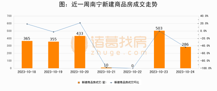 根据南宁市住房和城乡建设局数据显示,2023年10月24日南宁新建商品房成交286套,较昨日减少217套,环比下降43.1%
