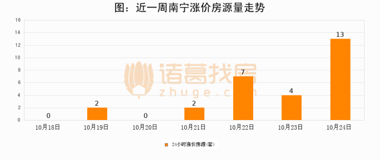 根据诸葛找房数据显示,南宁24小时涨价房源量为13套,较10月23日增加9套,环比上涨225%。与此同时,涨价房源占比小幅扩大,业主信心有所提升。