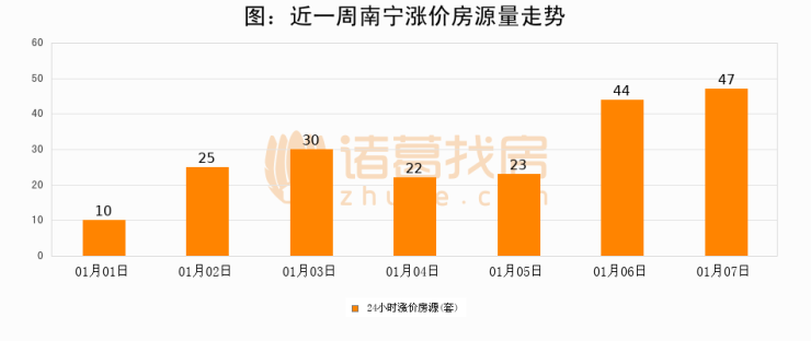 根据诸葛找房数据显示,南宁24小时涨价房源量为47套,较01月06日增加3套,环比上涨6.8%。与此同时,涨价房源占比小幅扩大,业主信心有所提升。