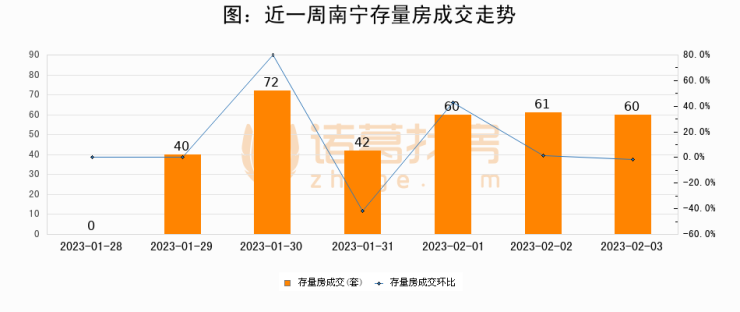 从存量房来看,2023年02月03日南宁存量房单日成交60套,比昨日减少1套,环比下降1.6%。从近一周存量房成交来看,南宁存量房日均成交套数为47套,其中01月30日成交量最高为72套,02月03日单日成交60套,高于近一周平均水平27.7%。