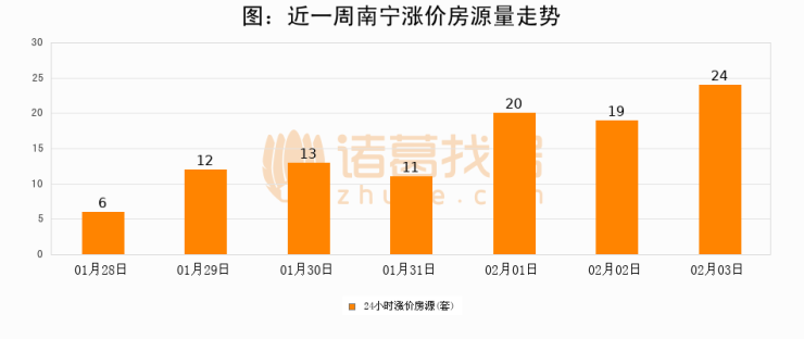 根据诸葛找房数据显示,南宁24小时涨价房源量为24套,较02月02日增加5套,环比上涨26.3%。与此同时,涨价房源占比小幅扩大,业主信心有所提升。