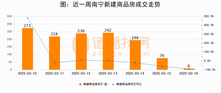 根据南宁市住房和城乡建设局数据显示,2025年03月16日南宁新建商品房成交8套,较昨日减少68套,环比下降89.5%。近一周南宁新建商品房日均成交179套。03月16日单日成交8套,低于近一周平均水平95.5%。