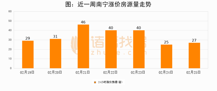 根据诸葛找房数据显示,南宁24小时涨价房源量为27套,较02月24日增加2套,环比上涨8%。与此同时,涨价房源占比小幅扩大,业主信心有所提升。